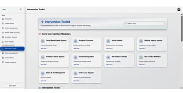 Explore the tools that make proactive mental‑health support simple, secure, and scalable. From AI‑driven screenings and real‑time dashboards to ready‑to‑use intervention guides and localized resources, each feature is designed to empower counselors and uplift every student’s well‑being.