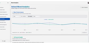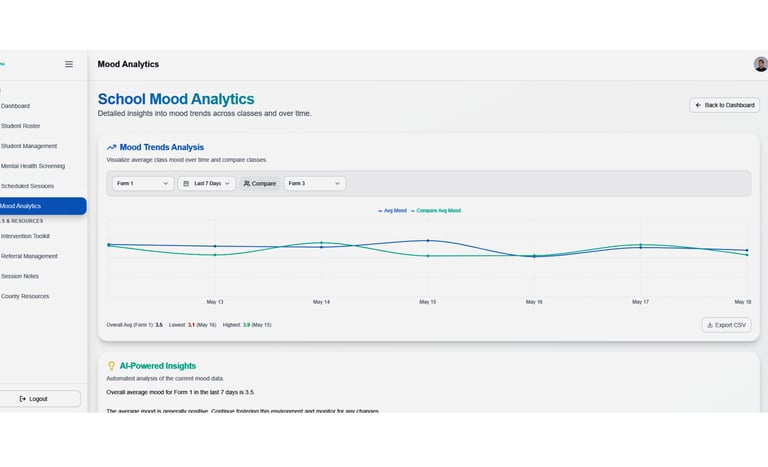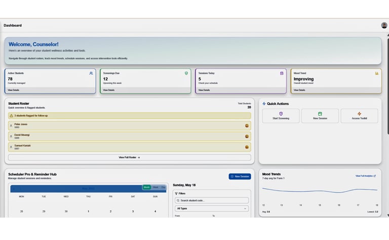 Get a 360° view of student well‑being with real‑time metrics, mood trends, and quick action buttons—all in one place